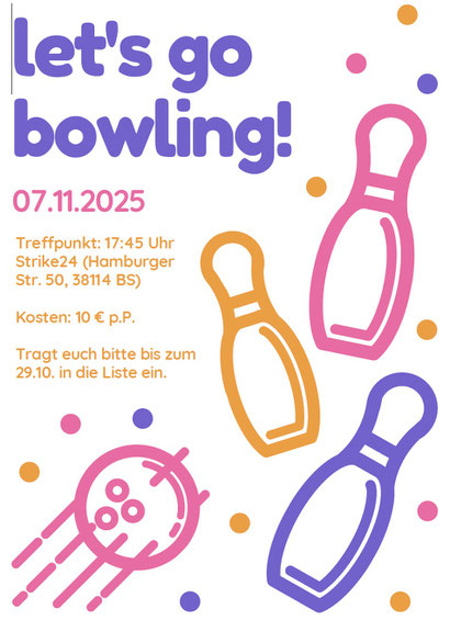 am 07.11.2025 möchten wir gerne mit euch bowlen gehen! Wir treffen uns um 17:45 Uhr bei Strike24 (Hamburger Str. 50; 38114 Braunschweig).
